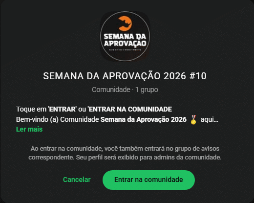 Parabéns, sua vaga foi reservada! 😃Você será redirecionado(a) para a comunidade da Semana da Aprovação 2026 no WhatsApp!